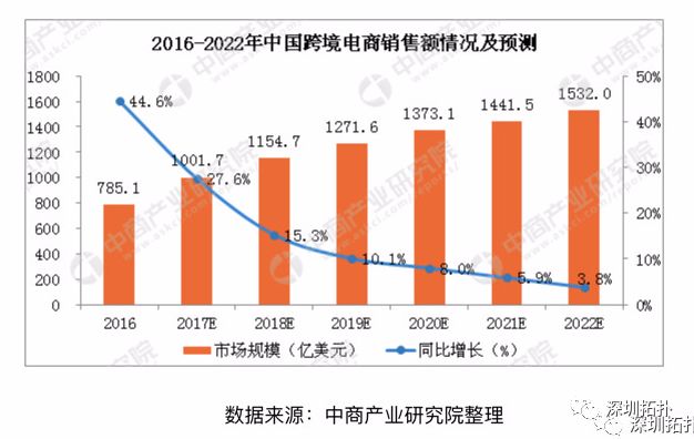 可自2016年以來,跨境電商近三年增速放緩,2019年預(yù)計增長率在10%左右。從2020年開始,每年的增速將低于10%。