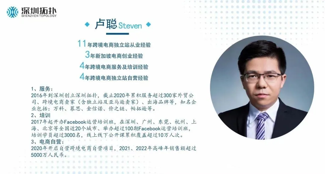 盧聰老師:深圳前海拓?fù)湫畔⒓夹g(shù)有限公司創(chuàng)始人,浙江大學(xué)中國跨境電子商務(wù)大講堂講師團(tuán)專家,江西財(cái)經(jīng)大學(xué)國際經(jīng)貿(mào)學(xué)院創(chuàng)業(yè)指導(dǎo)老師,廣東跨境電子商務(wù)協(xié)會(huì)高級講師。