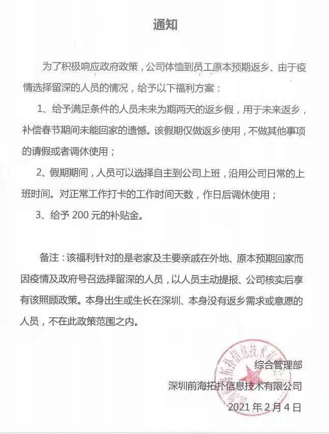 在今年各地疫情反復(fù)無常、深圳發(fā)起關(guān)于人員留深過年的的倡導(dǎo)下,深圳拓?fù)湟卜e極響應(yīng),呼吁全員“無必要,不離深”、“我在深圳過新年”。并且推出多項(xiàng)政策支持留深過年的人員,得到留深人員的積極回應(yīng):