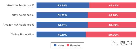 數(shù)據(jù)顯示,在2018年2月3日前的4周內(nèi),在線受眾之間沒(méi)有性別優(yōu)勢(shì)。亞馬遜和eBay用戶之間的性別差異僅有輕微的男性偏差,這與在線澳大利亞人的總?cè)丝谙嚓P(guān),51%為女性,49%為男性。