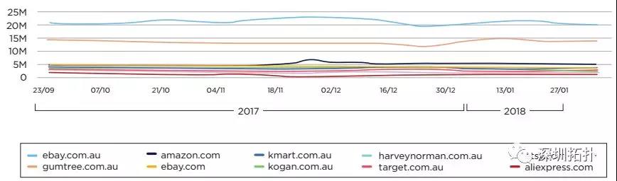 在過(guò)去20周的時(shí)間里,eBay.com.au相對(duì)于其他零售商店 ——無(wú)論是在線商店還是實(shí)體店—— 都絕對(duì)占據(jù)了網(wǎng)站訪問(wèn)量。 隨著Amazon.com.au(以下簡(jiǎn)稱亞馬遜AU)的推出,我們可能會(huì)預(yù)期這些數(shù)字會(huì)發(fā)生變化,流量可能會(huì)流向亞馬遜AU。 也許這將以犧牲Amazon.com為代價(jià),或者相反,隨著更多賣家增加產(chǎn)品,改善庫(kù)存,可能只是所有網(wǎng)站的流量和比較訪問(wèn)整體增加。