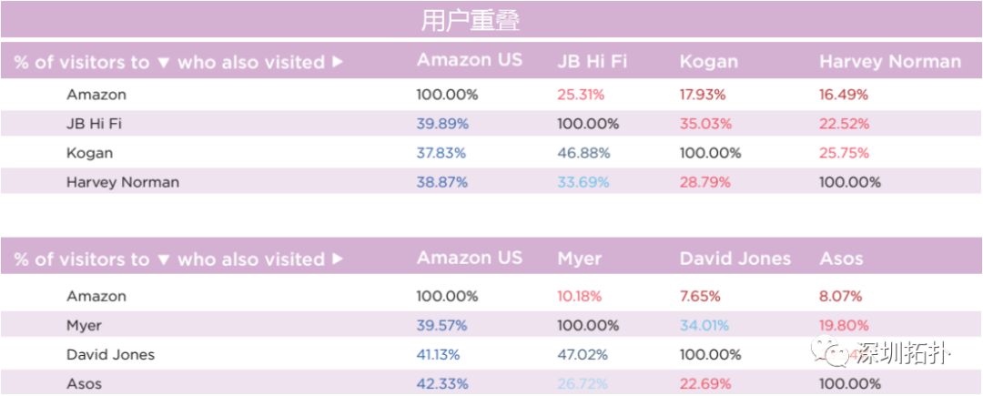 上述獨(dú)占與共享受眾的數(shù)據(jù)表明,澳大利亞電子產(chǎn)品與服裝之間的消費(fèi)者購(gòu)物行為存在明顯差異。電子產(chǎn)品零售商重量級(jí)人物的整體受眾數(shù)量更大,因此與亞馬遜相比,獨(dú)占受眾人數(shù)更多。然而電子產(chǎn)品零售商的亞馬遜受眾比例也高于服裝零售商——看來(lái)澳大利亞消費(fèi)者在電子產(chǎn)品在線時(shí)已經(jīng)開始進(jìn)行大量的比較購(gòu)物,但尚未真正將亞馬遜與服裝聯(lián)系起來(lái)。