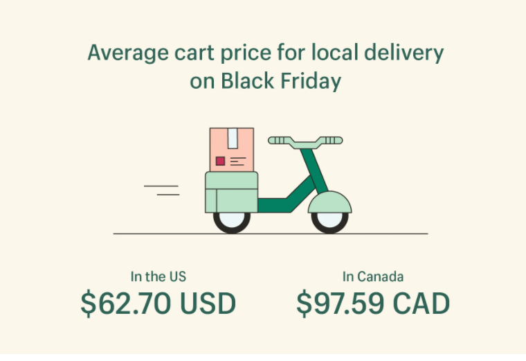 在黑色星期五,路邊取貨訂單的平均購物車價(jià)格在美國為78.60美元,在加拿大為93.81加元。至于本地送貨,美國的平均購物車價(jià)格為62.70美元,加拿大為97.59加元。