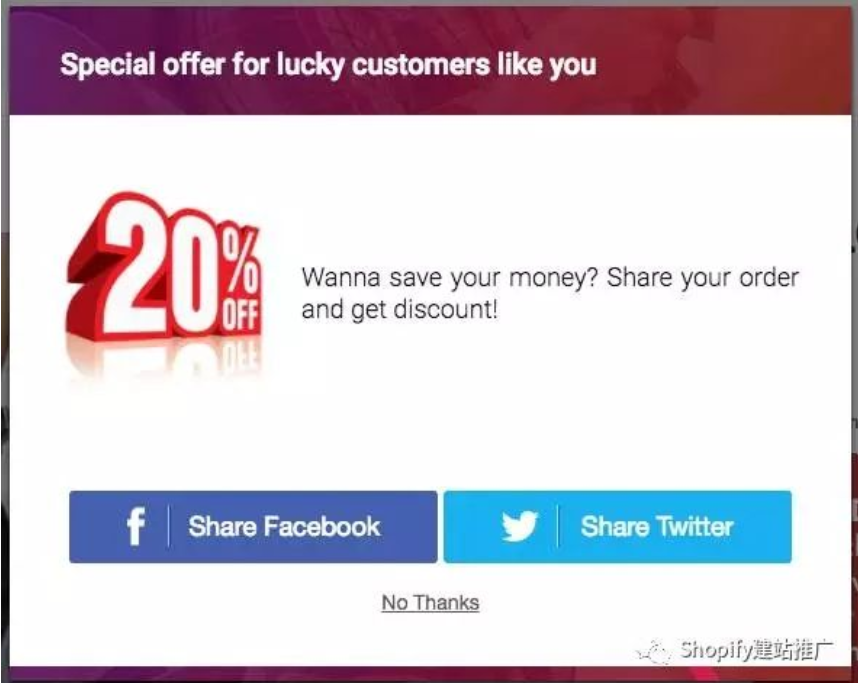 比如,分享你的shopify店鋪到facebook,店鋪就給她發(fā)送一個(gè)10% off 的打折碼。