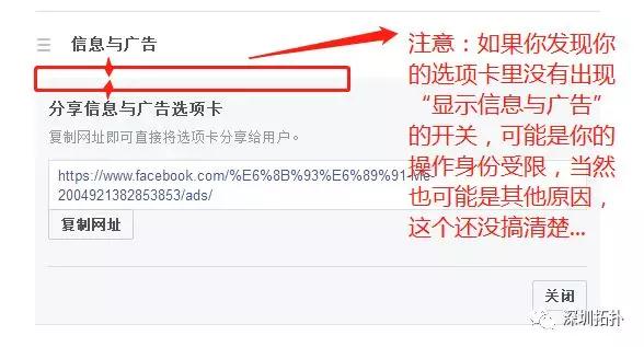 (1)進(jìn)入相應(yīng)的Facebook主頁,可以看到主頁左欄的“信息與廣告”