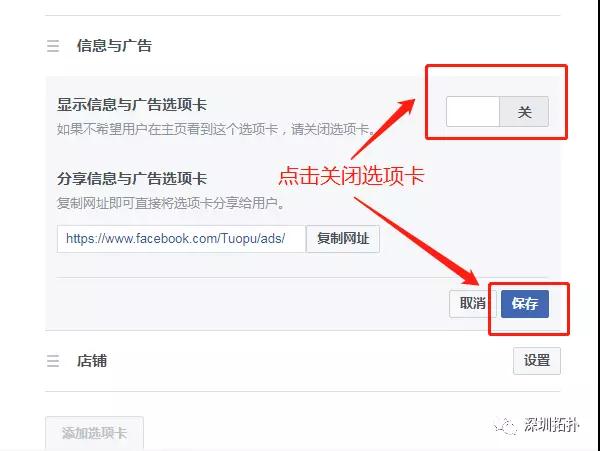 (3)看到“宣示信息與廣告選項(xiàng)卡”,選擇“關(guān)”,之后“保存”