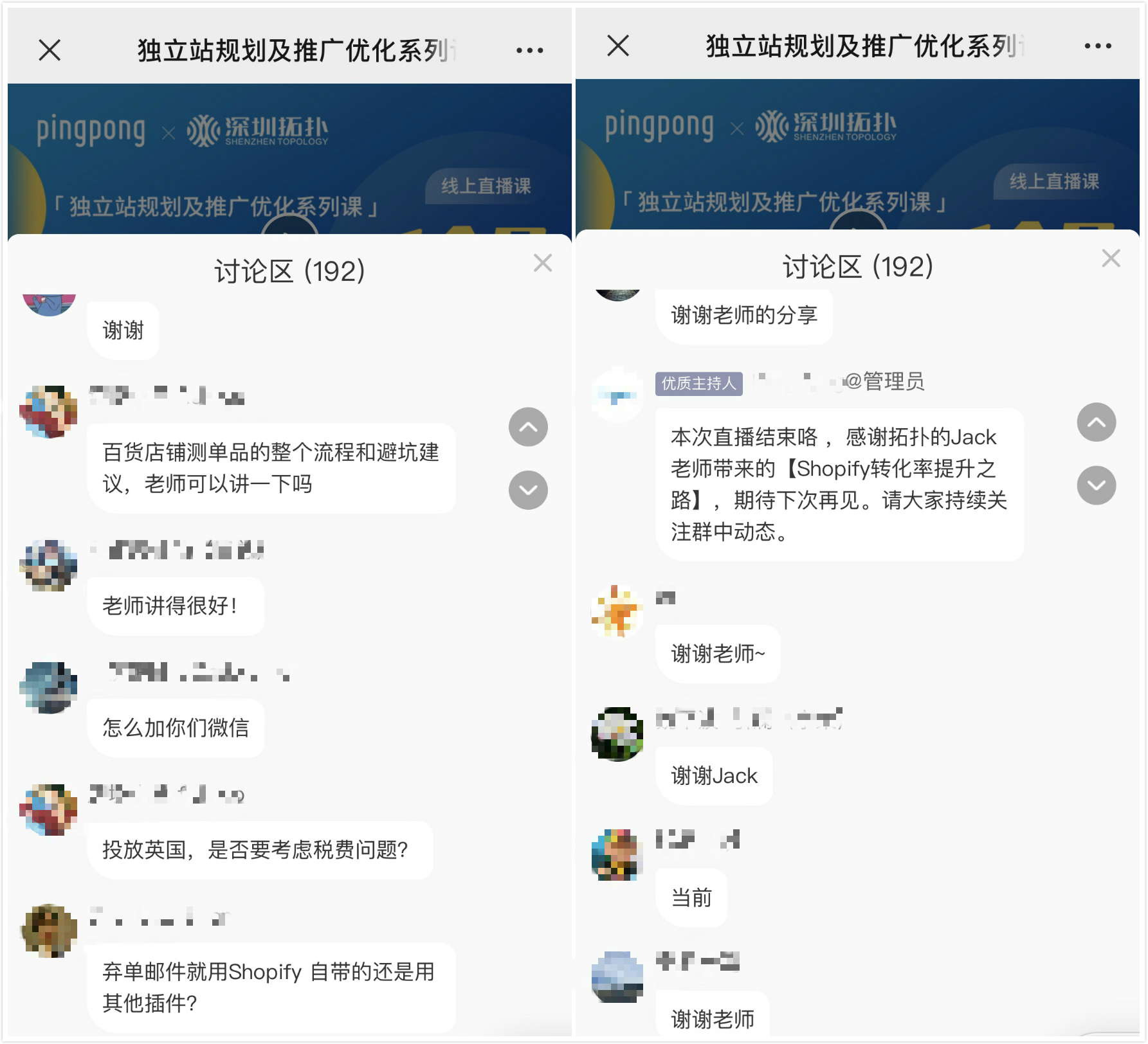 Jack在課程中與大家分享了自己多年的Shopify運營經驗,從廣告與網(wǎng)站兩個方面講解如何有效提升Shopify轉化率,并提供了一系列插件使用技巧。即使當前是在特殊時期,大家的學習熱情依舊高漲,該場直播共有665人次收看,討論區(qū)反響熱烈,累計互動192次。