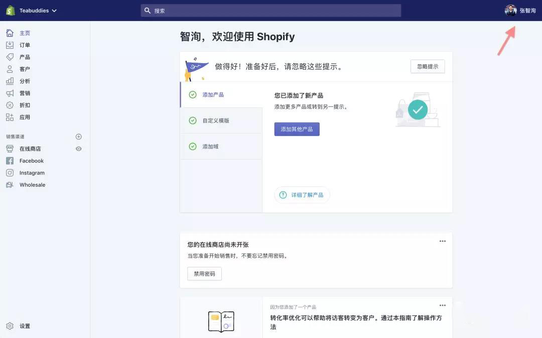 第1步:在Shopify后臺(tái)界面右上角點(diǎn)擊賬戶名稱